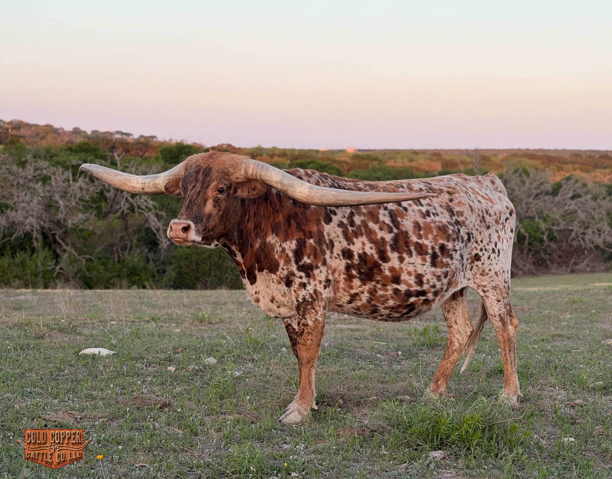 What a beautiful addition to Cold Copper. She is as sweet as she is colorful, and a horn set to die for. She gave us a beautiful heifer by PCC DARK KNIGHT and is currently CONFIRMED BRED to POWERWAGON! Check him out-LEADING THE WAY for horn production and show ring quality progeny.