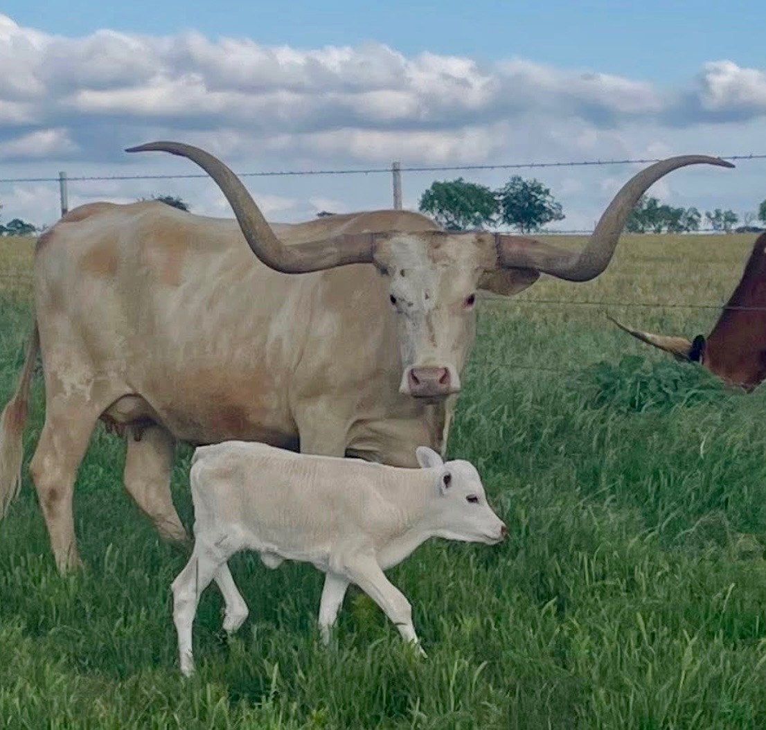If you haven't heard of PCC Single Scoop and PCC Poco Bomber you probably haven't been keeping up with pedigrees very long. Scott Pace will not sell Single Scoop saying that she hits a home run every time. I can believe with this daughter of hers out of Gold Mine. Big bodied cow with a correct build and a very serious twist to her horn set. Her 2024 heifer out of Show Boat we love and plan on keeping and her Batman heifer in 2025 is looking great. Another easy going cow that will eat from your hand.