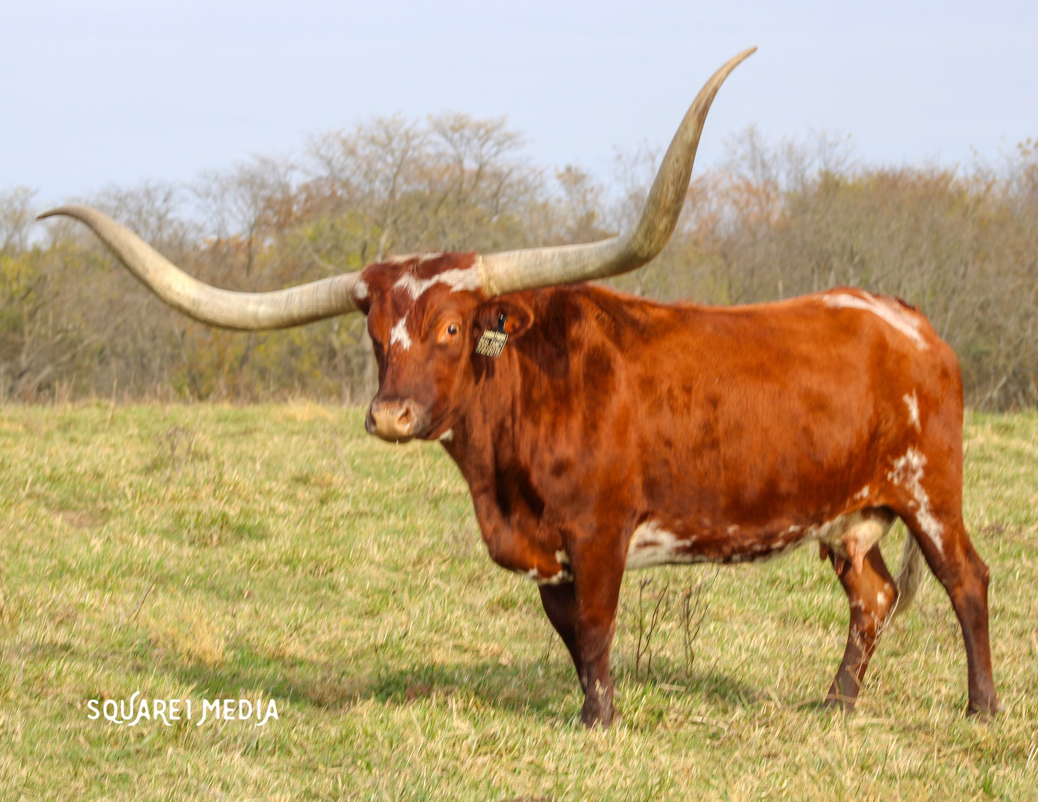 Deep red mahogany color with a load of total horn! She is very sweet and raises big beefy calves.