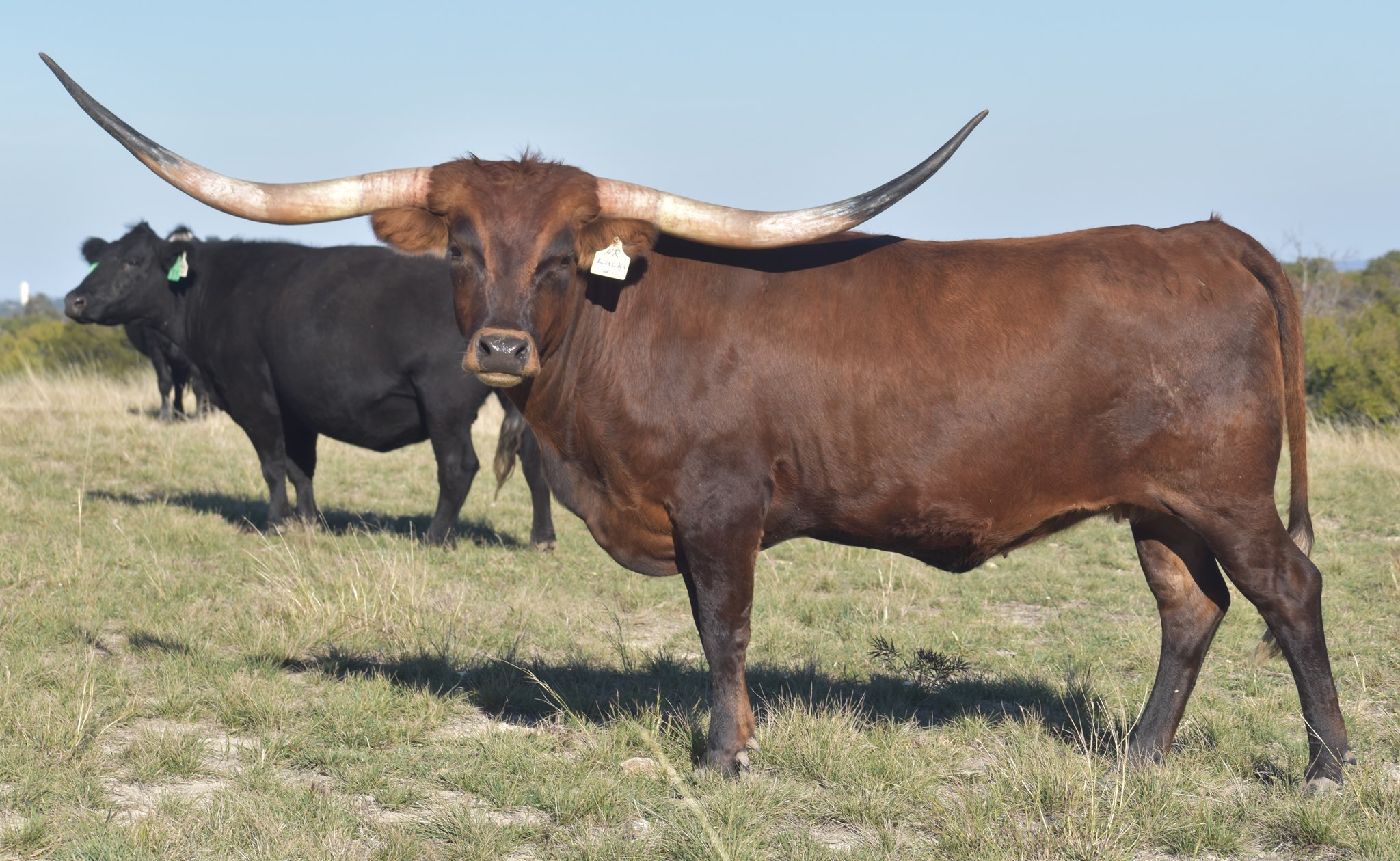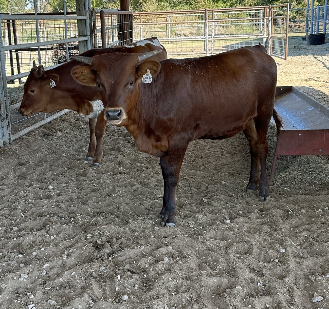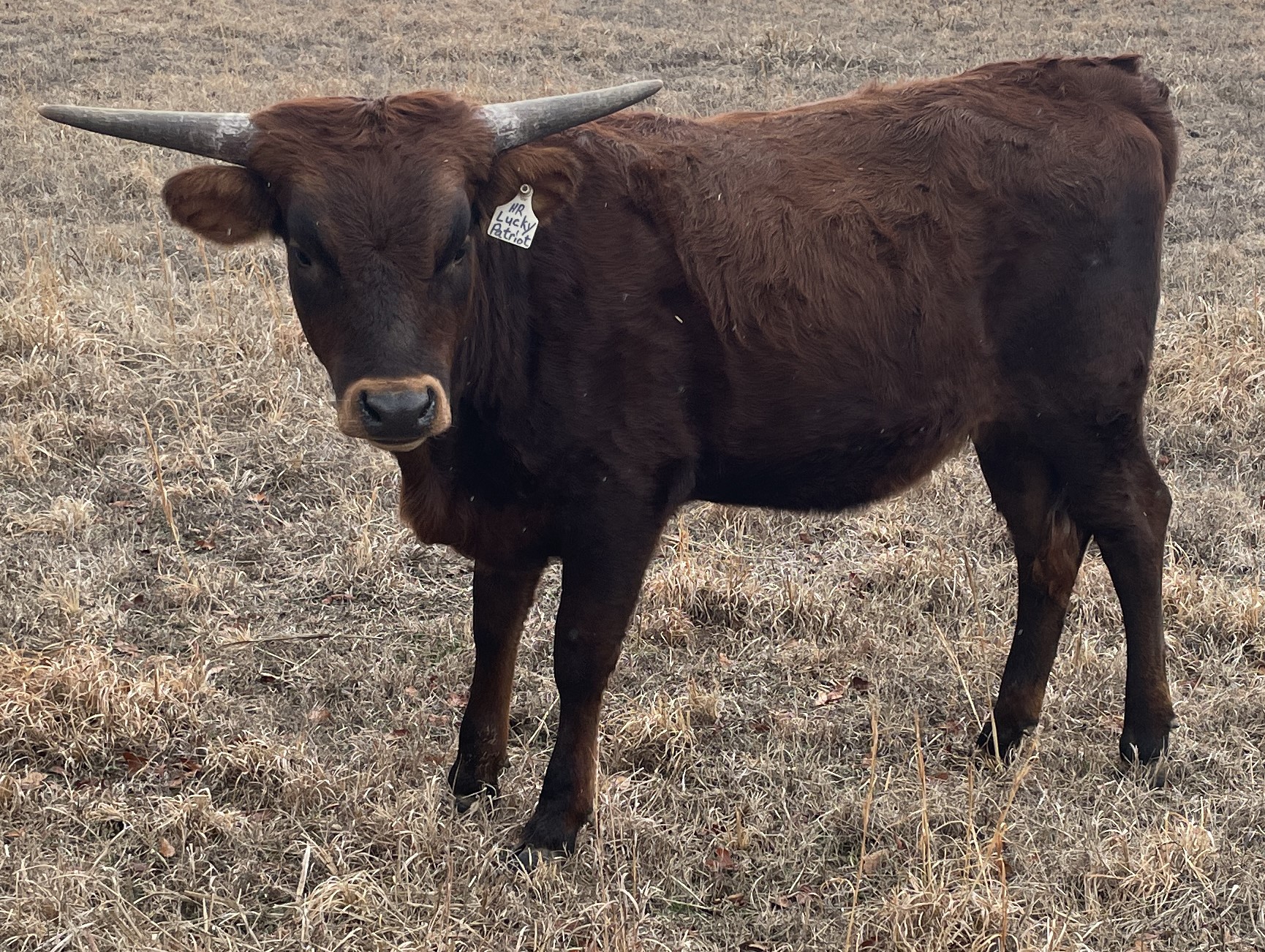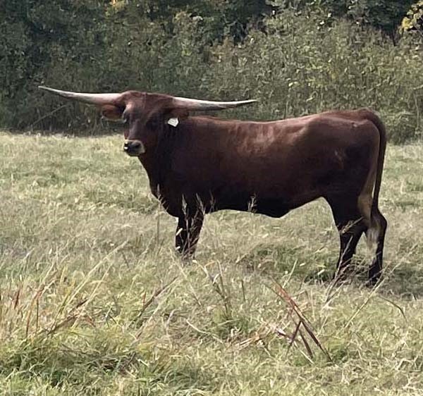 HR Lucky 40 is 5 generations deep with HR breeding. She represents the total package we strive for in every calf. Big frame, deep-bodied, big horns, and quiet demeanor. Her sire is over 100" TTT and is out RC Pacific Mermaid the only cow to have produced 3 offspring over 100" TTT. You will see she also goes back to Patriot HR, Rebel HR, HR Slams Rose, and LLL Rosemary. Rebel bull calf at side born 9-8-24.
