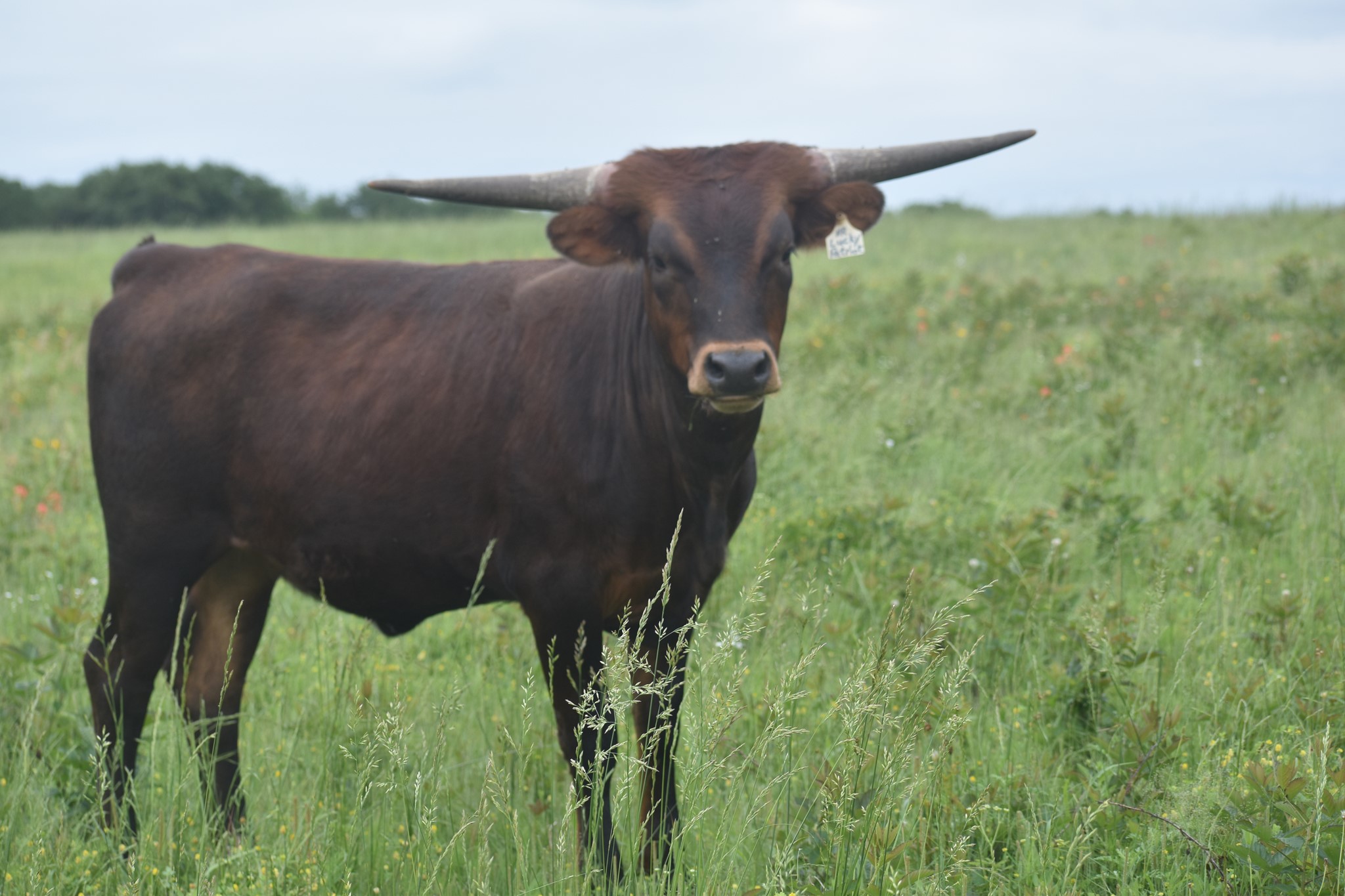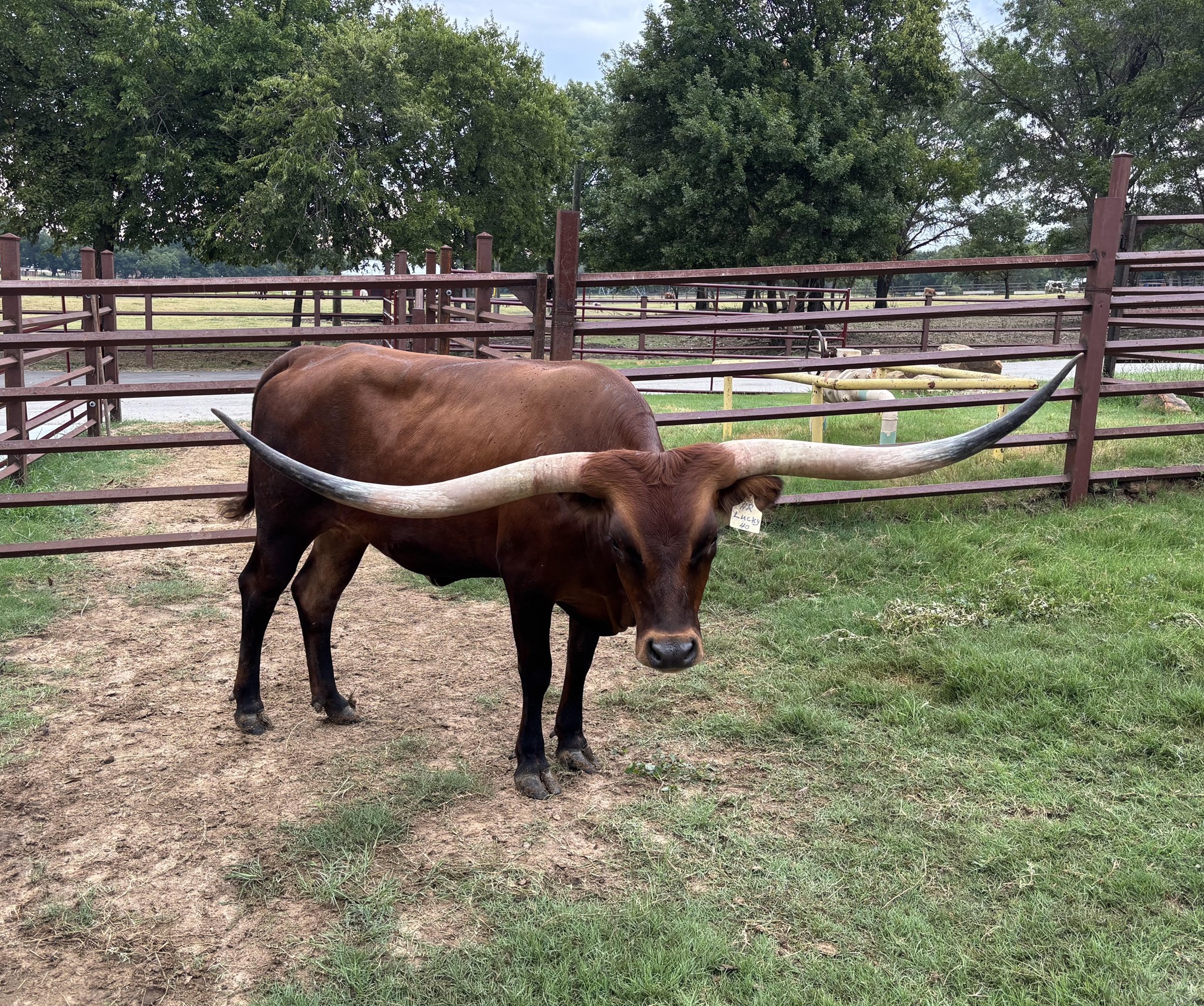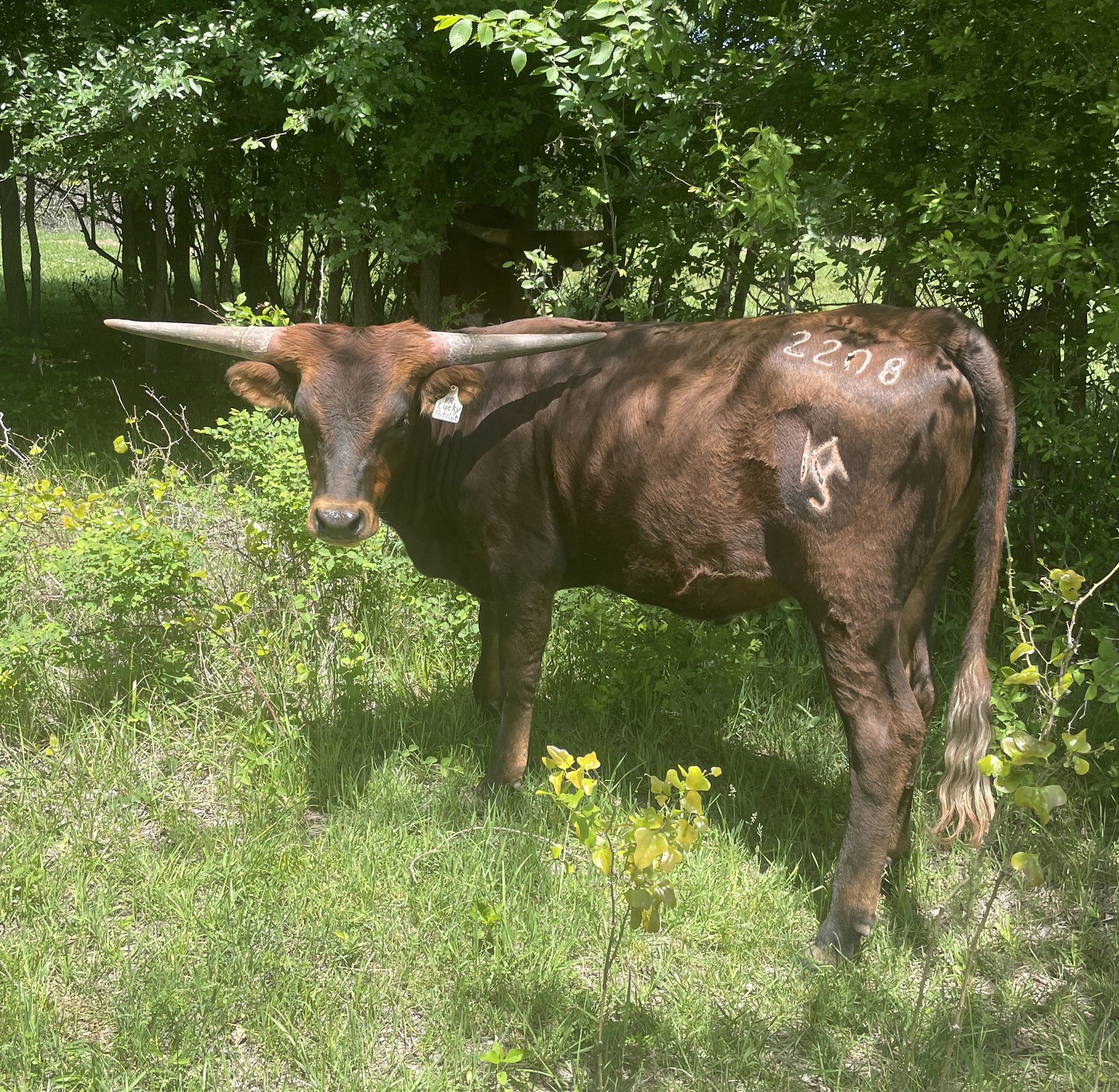 HR Lucky 40 is 5 generations deep with HR breeding. She represents the total package we strive for in every calf. Big frame, deep-bodied, big horns, and quiet demeanor. Her sire is over 100" TTT and is out RC Pacific Mermaid the only cow to have produced 3 offspring over 100" TTT. You will see she also goes back to Patriot HR, Rebel HR, HR Slams Rose, and LLL Rosemary. Rebel bull calf at side born 9-8-24.