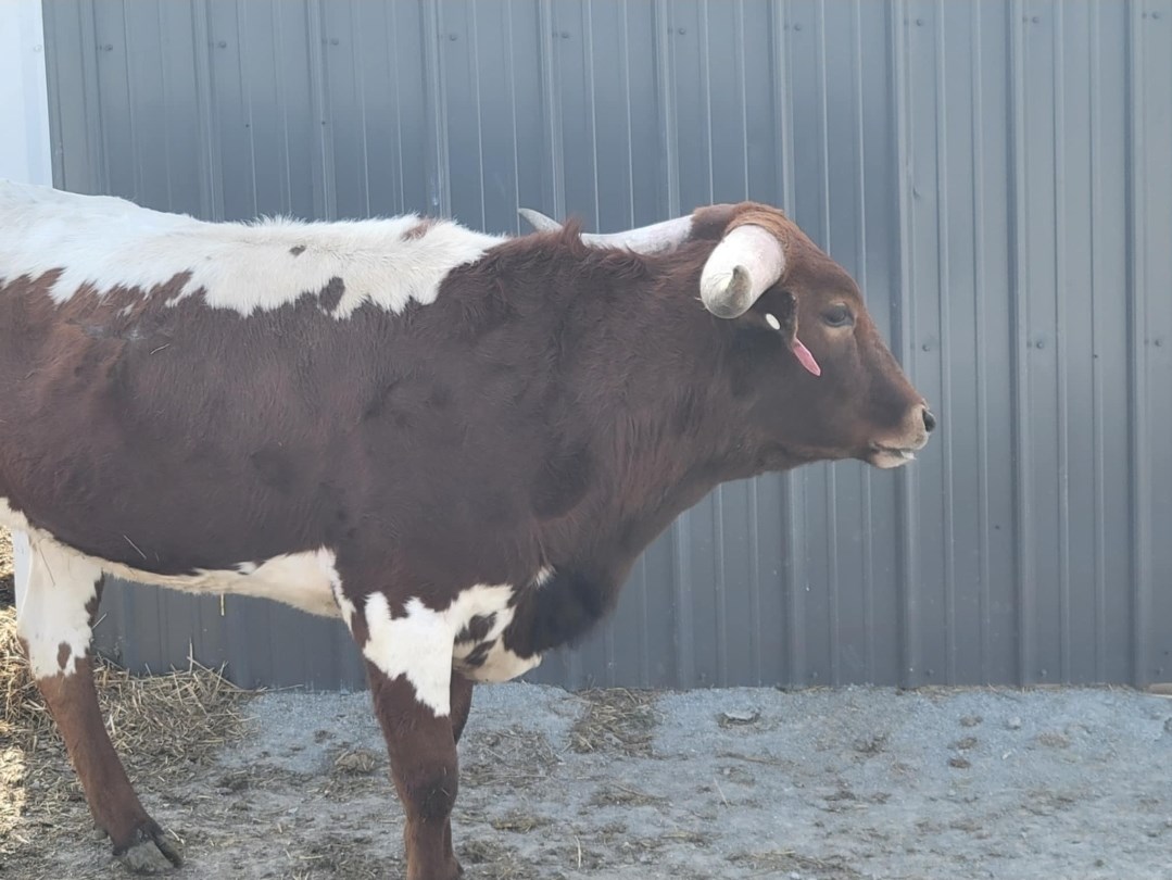 Look at the sway back horns on this girl! Delights is a Hubblles 20 Gauge daughter out of a Cowboy Catchit Chex daughter. This cross is very consistent and producing beautiful cows. She is a very correct and complete heifer that is going to have an amazing set of twisty horns!