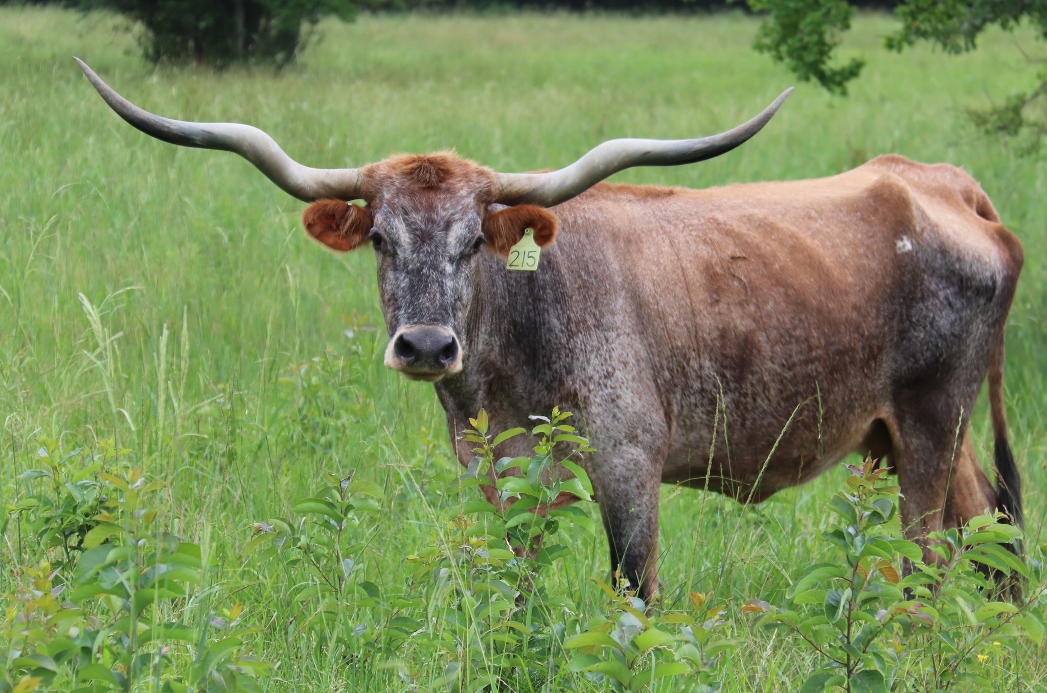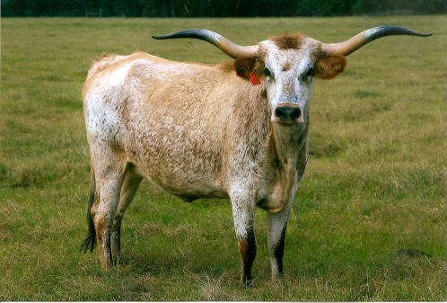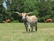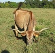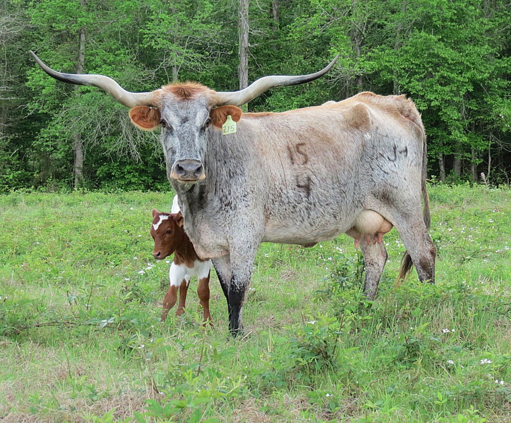 Guess who people see first in the pasture. Palmetta Check! This cow is absolutely beautiful in person. She is the prettiest orange in the late summer and come spring she’s turned blue. These are the twisty horns every breeder wants in their herd. She also has one of the prettiest udders we’ve seen. She raises big healthy calves and breeds right back.